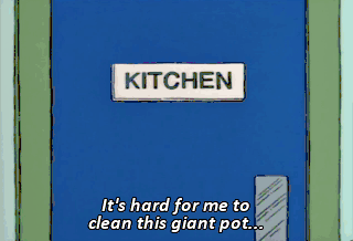 It's hard for me to clean this giant pot... when you keep spilling meat tenderizer all over me. Oh, great. Now I gotta work in the dark. Mmm.