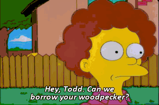 Hey, Todd. Can we borrow your woodpecker? I guess so. But we need him back by 6:00. It's his birthday. Okay. Ow!