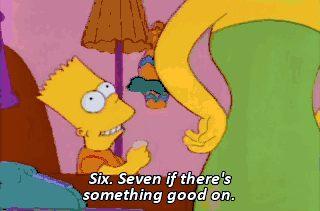 Six. Seven if there's something good on. Don't you think you should get a little fresh air? Yeah, but what are you going to do? TV gives so much and asks so little.