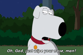 Oh, God, just wipe your nose, man! Can I have a hug, Brian? Oh, no, no, God, no, no, not now, no!