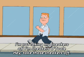 I'm not taking my sneakers off I'm Sneakers O'Toole Hey, take those sneakers off.