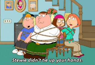 Stewie didn't tie up your hands. No, he must have forgot. You've realized, we've been sitting here for 14 hours. Well, get pissy if you want, Mom. I've enjoyed the time we've had as a family.