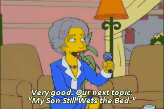 Very good. Our next topic, "My Son Still Wets the Bed." You told me we were going to Red Lobster.