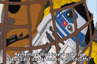 Remember that laser I used to break Leia out of Jabba's handcuffs? Well, here comes a little tiny saw! (ALL SCREAMING) Whoa! What the hell are these? Hamsters?
