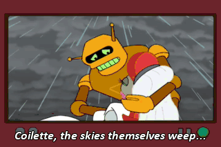 Coilette, the skies themselves weep... upon the sweetest flower of all the field. Sentimental drivel poop! Come on, Bender. Let's go. This chick flick is getting me all "barfy."