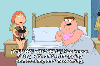 (MEOWS) (CHUCKLES) You know, Peter, with all the shopping and cooking and decorating, I have to say I'm really liking the new you an awful lot. An awful lot.
