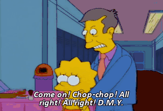 Come on! Chop-chop! All right! All right! D.M.Y. I know what that means, young lady! Huh?
