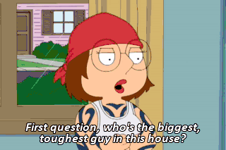 First question, who's the biggest, toughest guy in this house? Well, I don't like to toot my own horn, but I believe I hold the distinction... (GRUNTS)