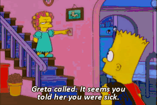 Greta called. It seems you told her you were sick. Lisa, I only lied because it was the easiest way to get what I wanted. Bart, this girl is in love with you. Think about it.