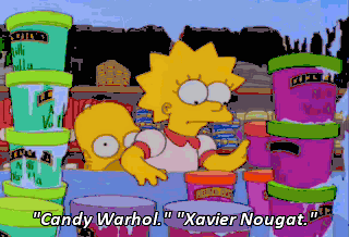 "Candy Warhol." "Xavier Nougat." Naw. Nothin' made of dead guys. What's in the back? Hurry up. My hands are getting cold. Ah-choo! Oh, my goodness! - Homer, get her out of there. - Aw!