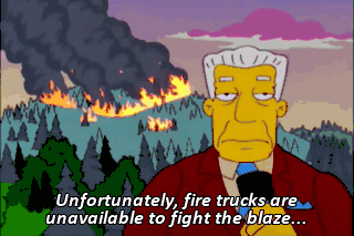 Unfortunately, fire trucks are unavailable to fight the blaze... as they're all being used to film the new Burt Reynolds movie, Fireball and Mudflap.