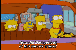 How did Dad get out of this snooze cruise? He's cleaning out the garage. I can picture it now. I cleaned out the garage and lost 50 pounds. (LAUGHS) (SIGHS)