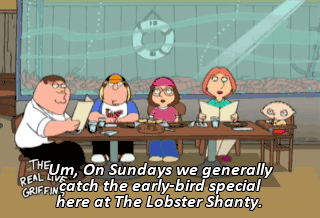 Um, On Sundays we generally catch the early-bird special here at The Lobster Shanty. Uh, Fresh seafood, good prices. Plus, it's a shanty.