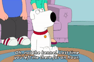 Oh, not the kennel. Last time you left me there for an hour. Or 10 years, I don't know. There's no clock there! You stink when you come out of there.