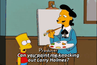 Can you paint me knocking out Larry Holmes? Certainly. Dont hit my face. Okay. Where do you want it? I dont know. Work the stomach. Mmm. That takes me back. pp Check out those non-skybox losers...