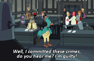 Well, I committed these crimes, do you hear me? I'm guilty! Bailiffs, get that innocent robot out of my courtroom. Guilty!