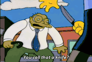 You call that a knife? This is a knife. Down I go. Oh. Oh, hi, Bart. I'd gladly share these sweet cookies with you... if only you would help me remove this ribbon.