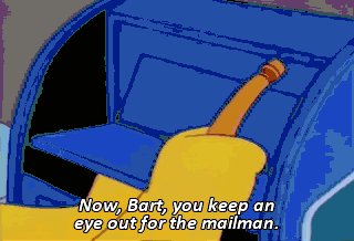 Now, Bart, you keep an eye out for the mailman. just give me some kind of signal. Dad, the mailman's here. That's a good one. We'll use that. No, I mean the mailman's here !