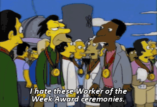 I hate these Worker of the Week Award ceremonies. Who even cares anymore? Everyone that works here has already got one. Except forrr--