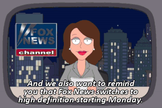 And we also want to remind you that Fox News switches to high definition starting Monday. Aw, crap! Does this mean we gotta get a new TV? Looks that way. Great.