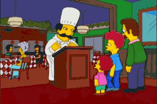 Oh, boy, oh, Boyardee! l bazoom-a you want a table. Right-a this way! Wow, Mom, your guns got us a great table... right by the lobster tank.