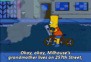 Okay, okay, Milhouse's grandmother lives on 257th Street, and I'm on 3rd. Ohh.