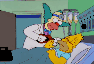 Krusty here to cheer you up... as part of the hospital's Last Laugh program. Last laugh? So, how about that hospital food, huh?