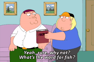 Yeah, sure, why not? What's the word for fish? Poisson. Good. - Dog? - Chien. - Seal? - Phoque. Chris, watch your language! No, that's how you say seal in French, phoque. He's right, Lois, look.