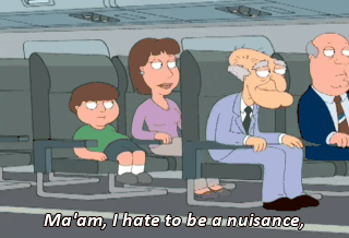 Ma'am, I hate to be a nuisance, but your son stopped kicking the back of my chair. Thank you. (ALL SCREAMING)