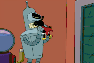 Oh, look, Bender, if you want something to do, stop making out and give us a hand. Here. Go up on the roof and install this fake satellite dish... so we can impress the neighbors. Yes, sir. I'm on it!