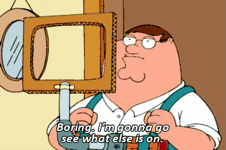Boring. I'm gonna go see what else is on. Peter! Keep an eye on Stewie.