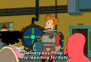 Delivery boy Philip J. Fry reporting for duty. Dr. Zoidberg, soaking in brine.