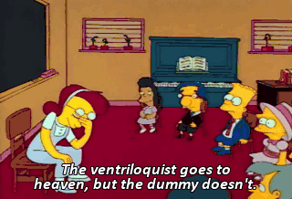 The ventriloquist goes to heaven, but the dummy doesn't. - Oh, oh, oh ! Me ! - Bart ? What about a robot with a human brain ?