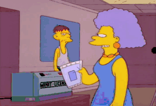 I just gotta go laminate your license. You'll get it in two to three weeks. Hot damn! No more sittin' in the dirt at the drive-in. Bart, I left the driver's-license-making machine on. Turn it off.