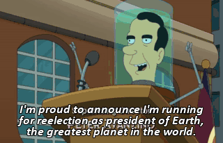 I'm proud to announce I'm running for reelection as president of Earth, the greatest planet in the world. ALL: Yeah! Is everyone enjoying their free beer? ALL: Yeah! Well, there's plenty more where that came from.