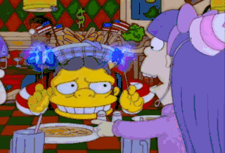 What, it's your birthday too? We're twins. Here you go. Here I am. Eat your fries. Eat 'em. Here's you! Aw, geez. And you got the stink lines and everything?