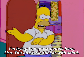 I'm trying to impress people here, Lisa. You don't win friends with salad. You don't win friends with salad You don't win friends with salad