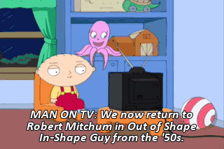 MAN ON TV: We now return to Robert Mitchum in Out of Shape In-Shape Guy from the '50s. Gambling is illegal in this town. - Says who? - Says me.