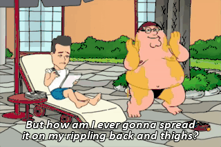 But how am I ever gonna spread it on my rippling back and thighs? This is gonna take drastic measures. All right, get the camera ready. Oh, Luke.