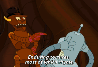 Enduring tortures, most of which rhyme Trapped forever here in robot hell. Of course, that's just for starters. Bender, are you all right?