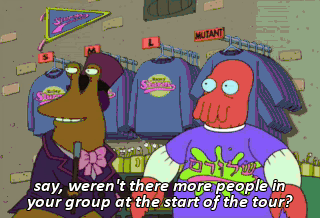 say, weren't there more people in your group at the start of the tour? Hey, yeah. Fry, Leela and Bender are missing. If you'll excuse me.