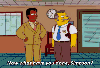 Now what have you done, Simpson? I was supervising the Guns for Toys program. It's Toys for Guns! Now you tell me. Oh! Simpson!