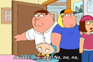A week! Aw, jeez! No, no, no, no, No! Please, God, kill me now.