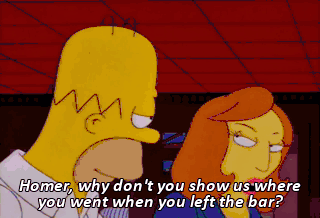Homer, why don't you show us where you went when you left the bar? I was standing right here when the horrible creature emerged from the woods.