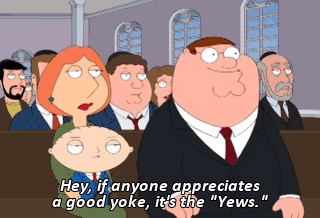 Hey, if anyone appreciates a good yoke, it's the "Yews." (LAUGHING) That's my Jewish laugh. I'm working on a Jewish laugh.