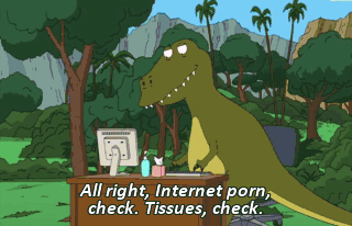 All right, Internet porn, check. Tissues, check. Lotion, check. Okay, let's go. Aw! (GROWLS) (ROARING)