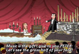 Music is the gift I give to you PETER: Let's see the gross half of your face! Come on!