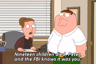 Nineteen children died, Peter, and the FBI knows it was you. Mr. Griffin, this court finds you guilty and sentences you to seven days in prison. You'll be out next Sunday at 9:00.