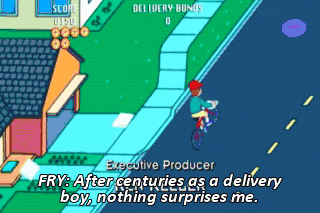FRY: After centuries as a delivery boy, nothing surprises me. You stink, loser. LEELA: Hey, Fry! Pizza going out! Come on! All right. I'll take the Red Rocket.