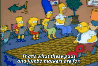 That's what these pads and jumbo markers are for. I want you to draw for me your fears, your anxieties, the roots of your unhappiness. Take a deep, cleansing breath.